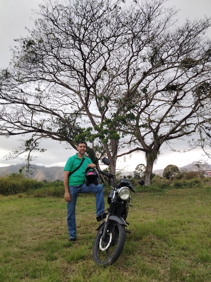 A man in a green shirt and jeans poses with a motorcycle on a grassy field. He rests his leg on the motorcycle and holds a helmet. Behind him stands a large tree with many bare branches reaching towards a cloudy sky. In the background, gentle hills and some buildings dot the landscape. The scene suggests a rural or semi-rural environment.