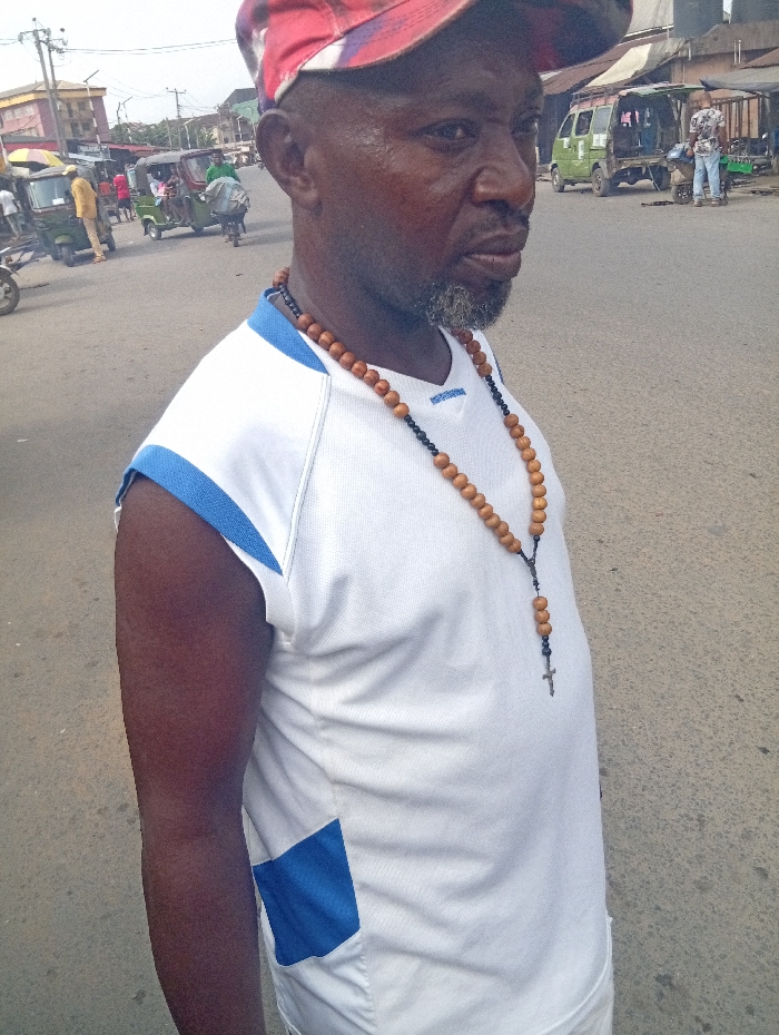 A man wearing a white shirt with blue accents and a rosary is standing in what appears to be a busy street