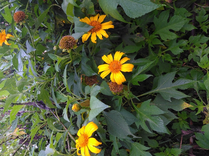 The image captures a dense cluster of flowering plants in Mouangkeo, Laos. Multiple bright yellow, daisy-like flowers with distinct orange-yellow centers are prominent, exhibiting characteristics consistent with *Tithonia diversifolia* (Mexican sunflower). Approximately five fully open blossoms are visible, interspersed with several unopened buds and multiple dried, brown seed heads, indicating varying stages of bloom and senescence. The plants feature abundant, deep green foliage with lobed or serrated margins; some leaves display visible water droplets on their surfaces. The background consists solely of more dense green vegetation, with no visible sky or artificial structures. No human subjects or animals are present in the frame.