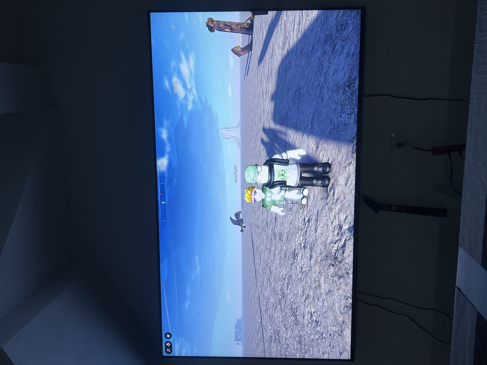 A television screen displays a video game environment. Two cartoonish figures, possibly player avatars, stand on a rough, textured surface that appears to be a landscape within the game. The sky is bright blue with some clouds. A black bird flies in the sky. The background shows a distant mountain range. A rusty anchor with a chain is situated nearby. The game interface includes elements such as a compass and player names. The game is not located in the city of Cholula, Mexico. The television is mounted on a wall in a room with visible electrical outlets and wires.