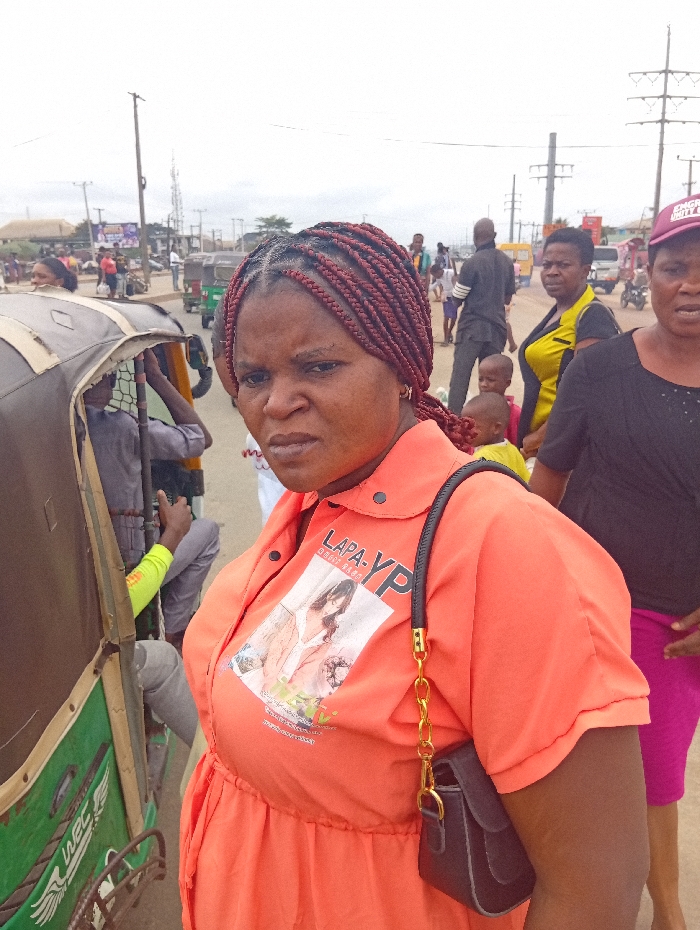 The image depicts a street scene in Ura Nta Umuarandu, Nigeria, under an overcast sky. In the foreground, an adult African woman with red-brown braided hair stands centrally, looking directly at the viewer with a neutral expression. She wears an orange, collared, short-sleeved dress featuring a graphic print with the text "LAPA-YP" and an illustration of a female figure. A dark shoulder bag with a gold chain strap hangs over her right shoulder. To her immediate left, the front portion of a green and black auto-rickshaw is visible, with a person in a light grey shirt partially visible inside. In the midground, to the right of the main subject, an African woman in a black top and pink bottoms is visible, looking towards the right. Further back, another African woman in a yellow and black top is present, accompanied by two small children, one in a yellow top and one in a pink top. Various other African individuals, including a man in dark clothing, are scattered throughout the background, engaged in unidentifiable actions or standing. Utility poles with multiple overhead wires dominate the upper background, extending across the scene. Distant buildings and a second auto-rickshaw are visible, indicating an urban or semi-urban environment.