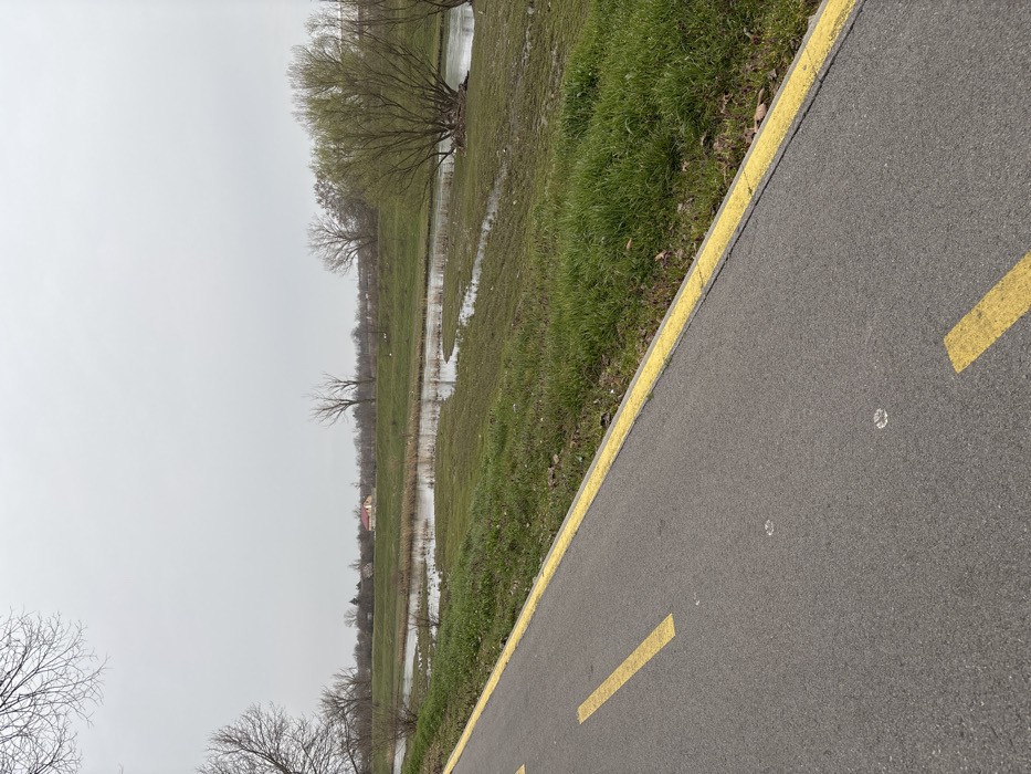 The image depicts an outdoor landscape within the city of Yambol, Bulgaria, under an overcast sky. The scene is devoid of human or animal presence. In the foreground, a dark grey asphalt pathway or bicycle lane occupies the lower left and extends diagonally towards the upper center. Its right edge is delineated by a continuous solid yellow line, bordering a grassy embankment. Intermittent dashed yellow lines are marked on the asphalt surface, indicating lane separation. Two circular, light-colored marks, consistent with dried residue, are visible on the pathway. To the immediate right of the pathway, a sloping grassy area exhibits varying shades of green, with some patches of drier vegetation and exposed soil. Beyond this grass, a body of water, possibly a river or a canal, flows or stands. The water surface is generally flat, with areas reflecting the grey sky and other sections partially obscured by reeds and emergent plant life. The water level appears high, potentially indicating recent rainfall or flooding, as it extends into grassy areas. The opposite bank of the water body is also grassy and gently sloped, leading to a line of trees. Several deciduous trees with bare branches are visible across the midground and background, characteristic of late winter or early spring. A prominent, multi-stemmed tree on the right side of the far bank displays early signs of budding green leaves. In the distant background, behind the tree line, several low-rise structures, including a building with a reddish-brown roof, are discernible against the horizon, suggesting a rural or suburban area.