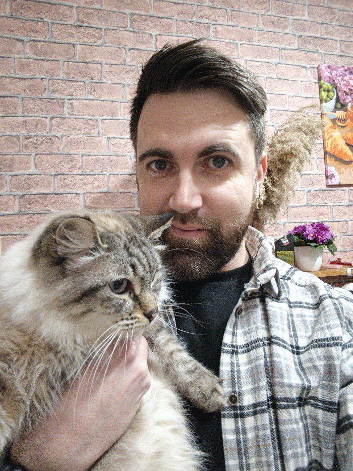 - "A man with dark hair and a beard holds a fluffy cat with tabby markings" by FM-YVp303, licensed under CC BY 4.0
