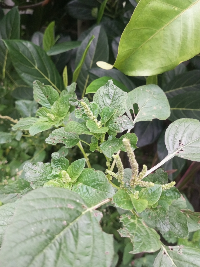 The image presents a close-up, high-angle view of dense green vegetation, situated in Tecuci, Romania. The primary subjects are multiple leafy plants with ovate to lanceolate foliage, predominantly in shades of medium to dark green. Numerous leaves exhibit signs of wear, including irregular holes and tattered edges. Scattered throughout the plant structure are multiple spiky, elongated inflorescences, light green to yellowish-green in color, consistent with flowering or seeding structures. The background consists of out-of-focus, darker green foliage, indicating further plant growth. No human subjects, animals, or man-made objects are present. The lighting is natural and diffuse, suggesting an outdoor environment.