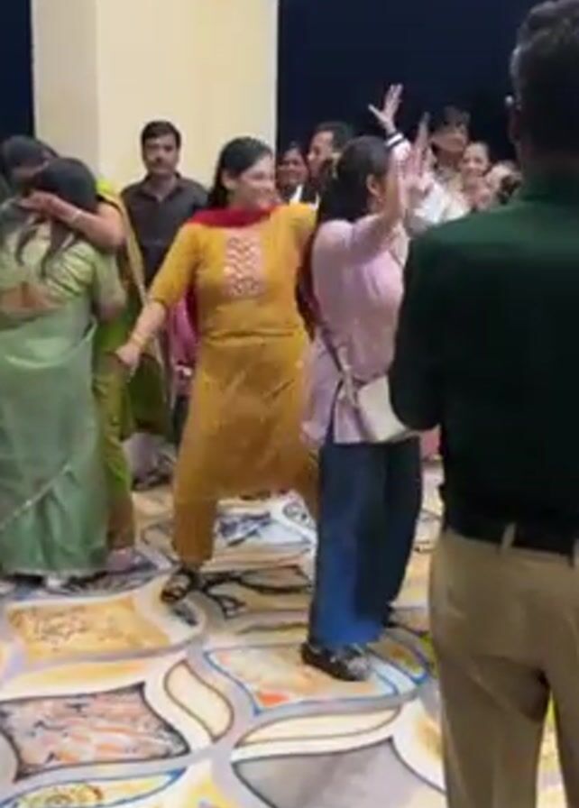 group of people dancing outdoors at night on a decorative tile floor under a roof supported by arched pillars. The camera is positioned behind a man in a green sweater and brown pants. The people are diverse in age and are mostly women, who are wearing brightly colored traditional Indian clothing. Some are in pants, others in dresses. They are smiling and waving their arms as they dance. A few men are also present, dressed in more casual attire. There is a small child in a pink jacket standing near the edge of the group. The overall atmosphere appears festive and celebratory.