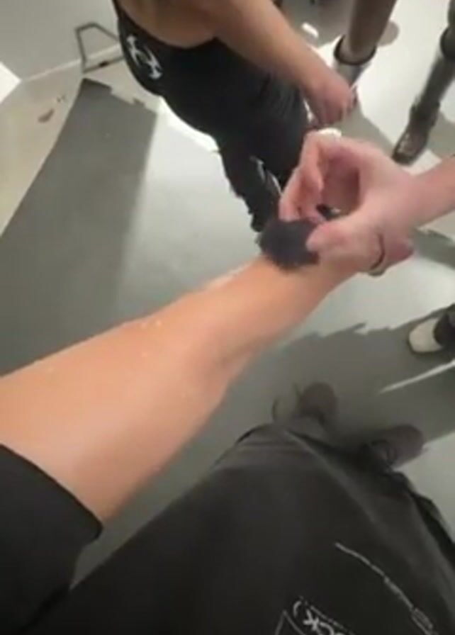 A group of people are gathered in what appears to be an indoor setting with a light gray floor. The camera angle is a first-person perspective, looking down at a person's arm being tended to. A hand is shown pressing a black, circular object covered in water droplets onto the arm, presumably for treatment. There are other individuals around, including one shirtless person wearing black athletic pants with an "Under Armour" logo, and another person in black pants and brown boots. The environment seems casual and intimate. A wheelchair is visible in the background.