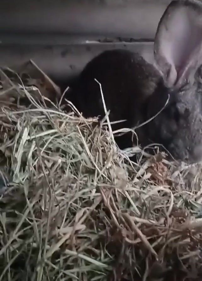 - "gray rabbit settled in a pile of hay within a pen or cage" by FM-ie9cp2, licensed under CC BY 4.0