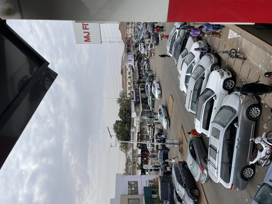 This image presents an elevated, wide-angle view of a busy urban street in Jos, Nigeria, specifically an intersection likely located on Ahmadu Bello Way, identifiable by the visible "MJ FITNESS" sign on the right. The sky is entirely overcast. The foreground is occupied by a dark, angled architectural overhang, indicating the elevated vantage point. Below, the street is characterized by heavy vehicular and pedestrian traffic. Approximately 40-50 vehicles, including sedans, SUVs, and minivans of various colors (predominantly silver, white, and dark shades), are visible. Many cars are parked along the curbs, while others are in motion or stopped at the intersection, suggesting congestion. A prominent silver Toyota Sienna minivan with roof rails is parked in the lower-left foreground, alongside a white motorcycle. An estimated 30-40 pedestrians are visible throughout the scene, walking on sidewalks, crossing streets, and congregating near storefronts. Individuals are dressed in a mix of traditional Nigerian attire and contemporary casual clothing. No specific interactions suggesting an unusual event are apparent; the scene depicts typical daily urban activity. Buildings line both sides of the street, predominantly multi-story commercial structures with various storefronts. A large white sign with red lettering for "MJ FITNESS" is partially visible on the right side of the image. Further into the scene, a "Tap and Give" sign is visible on another building. A street light pole equipped with two solar panels is centrally located within the intersection area. Overhead utility lines are visible crisscrossing the sky above the buildings. The overall environment is that of a dense, active commercial district.