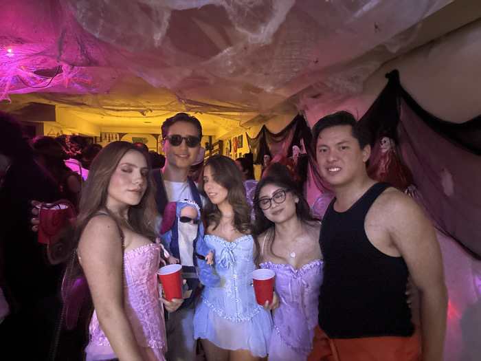 This image depicts an indoor Halloween-themed party in San Bernardino Tlaxcalancingo, Mexico. Five individuals are centrally positioned, posing for the camera under low, colored lighting, primarily pink and purple, emanating from above. The ceiling is draped with white, translucent fabric resembling cobwebs, and black fabric drapes are visible on the right, alongside skeleton or ghoul-like decorations in the background. From left to right: 1. A woman with long brown hair, wearing a pink corset-style top and holding a red plastic cup in her right hand. Her eyes are partially closed. 2. A man wearing sunglasses, a white t-shirt under a dark vest, holding a small light blue plush doll with a veiled face, and also holding the red cup belonging to the woman on his left. He is smiling. 3. A woman with long brown hair, wearing a light blue corset-style top with ruffled details and holding a red plastic cup in her left hand. She is smiling. 4. A woman with dark hair and eyeglasses, wearing a light purple strapless or off-the-shoulder dress and what appear to be light-colored fairy wings on her back. She is smiling gently and wears a silver necklace. 5. A man with dark hair, wearing a black tank top and orange shorts or trousers. He is smiling. The individuals are standing upright, facing the camera, and appear to be interacting casually within the festive, decorated environment.