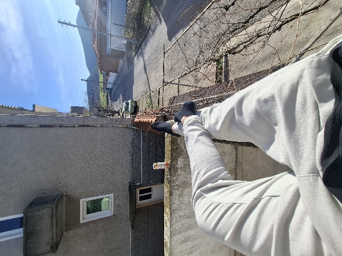 The image presents a first-person, downward-angled view from a balcony in the city of Veliki Preslav, Bulgaria, under a clear, sunny sky. In the immediate foreground, the legs and feet of an individual are visible, clad in light-colored trousers and dark socks, resting over a grey concrete balcony railing. To the left, a portion of a multi-story, grey stucco building features a white-framed window, a small concrete balcony, and a white, two-paneled door at a lower level. A white and yellow cylindrical object rests on the balcony ledge near the building wall. On the right, bare, intertwining tree branches or vines are present near the railing. Beyond the balcony, a paved asphalt road curves into the distance, lined with various residential buildings, many featuring reddish-brown tiled roofs. A light-colored, older model van or small truck is parked on the left side of the road. Multiple wooden utility poles with overhead power lines are visible along the street. The background reveals a series of distant green-tinged hills or mountains under a bright blue sky with sparse white clouds. No other individuals are visible in the scene.