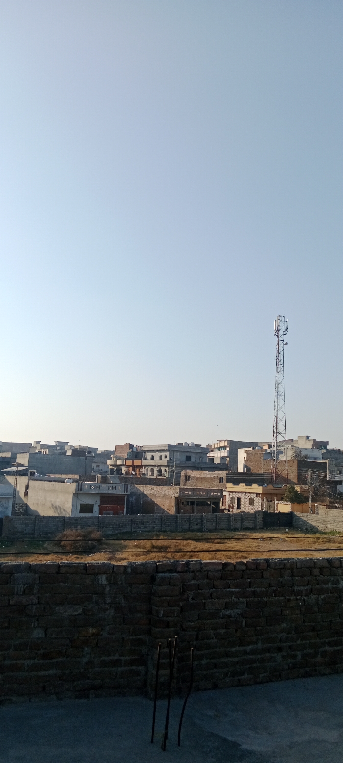 daytime urban environment under a clear, light blue sky, viewed from an elevated position. The immediate foreground features a dark, flat surface with a dark brick wall running horizontally across the lower portion. Three bent metal rebar rods protrude vertically from the flat surface near the wall on the right. Beyond this, a strip of dry, light brown ground is bordered by a grey concrete block wall. This wall fronts a dense aggregation of multi-story buildings, primarily residential or small commercial, constructed from concrete and brick in varying shades of grey, white, and brown. Flat rooftops with water tanks are common among these structures. A prominent grey metallic lattice communication tower, equipped with multiple antennae, stands to the far right, towering above the buildings and extending into the sky. No persons are visible, nor are any specific actions or interactions depicted. The location is the city of Unknown, Unknown.