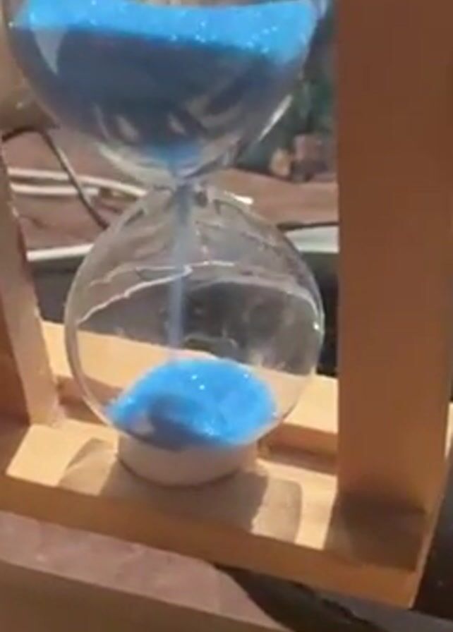 n hourglass with blue sand. The hourglass is held in a wooden frame. A hand rotates the hourglass to start the sand falling. The background is out of focus, but appears to be on a desk. There is a computer mouse and other unidentifiable objects in the background.