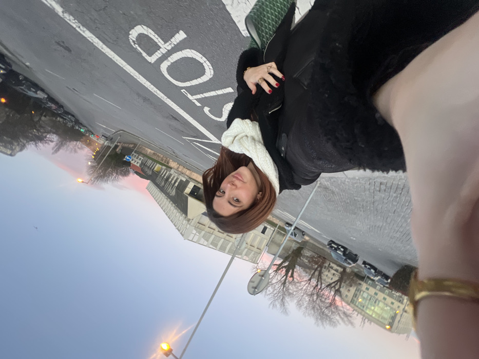 A young woman takes a selfie at dusk on a street. She wears a black coat, a white scarf, and multiple rings. A large "STOP" sign is painted on the asphalt near a crosswalk. Buildings and bare trees line the street with cars parked along the side. Streetlights illuminate the scene, and the sky transitions from light blue to pink with a faint sunset glow.