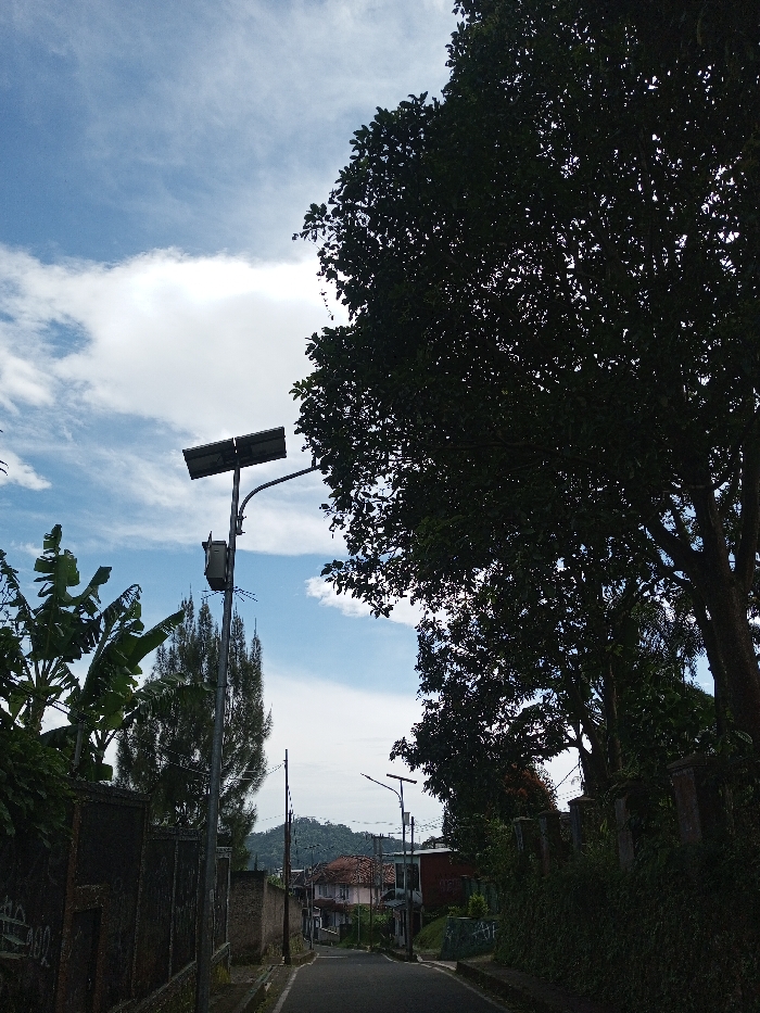 This image captures a residential street scene in Ariyalai, Sri Lanka, looking down a paved road that recedes into the distance under a partly cloudy blue sky. The left side of the foreground features dense green banana plant foliage adjacent to a dark, textured wall with minor surface details. Centrally positioned on the left, a tall metal utility pole supports a horizontal dual-panel solar array at its top, with a grey rectangular control or battery enclosure mounted below it. Further down the pole, a smaller antenna or sensor is attached. Behind this pole, a slender coniferous tree with dark green needles is visible. Adjacent to the road, a series of concrete or masonry walls delineate properties. The right side of the frame is largely occupied by a large, densely foliated tree with dark green, broad leaves, casting significant shadow. Below this tree, a wall covered with green climbing vegetation lines the roadside. The asphalt road, dark in color, slopes gently downwards. In the midground, several residential buildings with reddish-brown tiled roofs and lighter-colored facades are visible along the road. The background reveals a range of green, vegetated hills under a light haze. No individuals, animals, or vehicles are present in the visible area.
