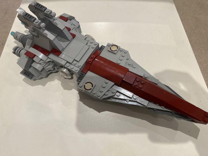 A grey and dark red LEGO model of a spacecraft, resembling a starship, rests diagonally on a smooth, light-colored surface