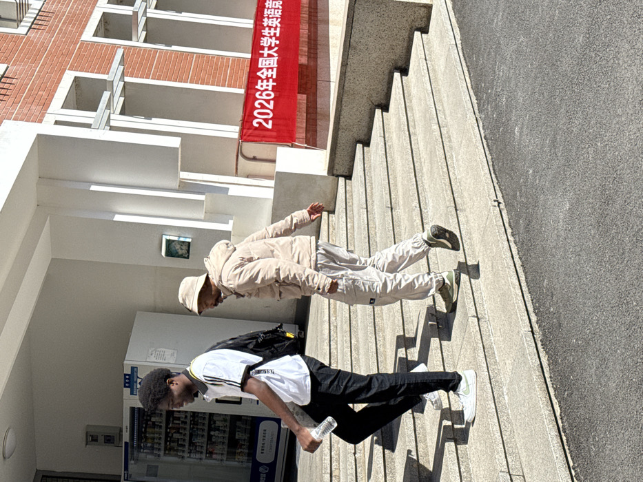 An outdoor scene captures two male individuals ascending a flight of concrete stairs in front of a building located in Daxing District, China. The building features a multi-tiered facade, primarily white with sections of red brick, and is illuminated by direct sunlight. A red banner, displaying the text "2026 全国大学生英语竞赛" (National College English Competition), is affixed to the building's brick section on the right. To the left of the stairs, a white vending machine is visible against the white facade. The individual on the left is a young male with dark, curly hair, wearing a white short-sleeved polo shirt with black stripes on the shoulders, dark pants, and white sneakers with light green accents. He carries a black backpack on his left shoulder and holds a clear plastic water bottle in his right hand. He is smiling and positioned with his left foot on a higher step, indicating upward movement. The individual on the right, positioned slightly behind and to the right, is a male with darker skin and a short beard, wearing a light beige bucket hat, a light beige hooded puffer jacket, light-colored cargo pants with elasticated cuffs, and green and black sneakers. He is captured mid-stride, with his left foot ascending a step and his right foot lifted, his arms slightly bent at the elbows with open hands. Both individuals are moving in the same upward direction on the stairs. The ground in the immediate foreground is dark asphalt.