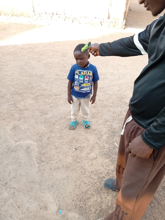 A small boy stands on a dirt ground, wearing a blue shirt, light-colored pants, and blue sandals. An individual extends an arm, holding a green toy gun to the boy's head. The person is partially visible, wearing a black long-sleeved shirt and brown sweatpants, with blue Crocs on their feet. A building is in the background.