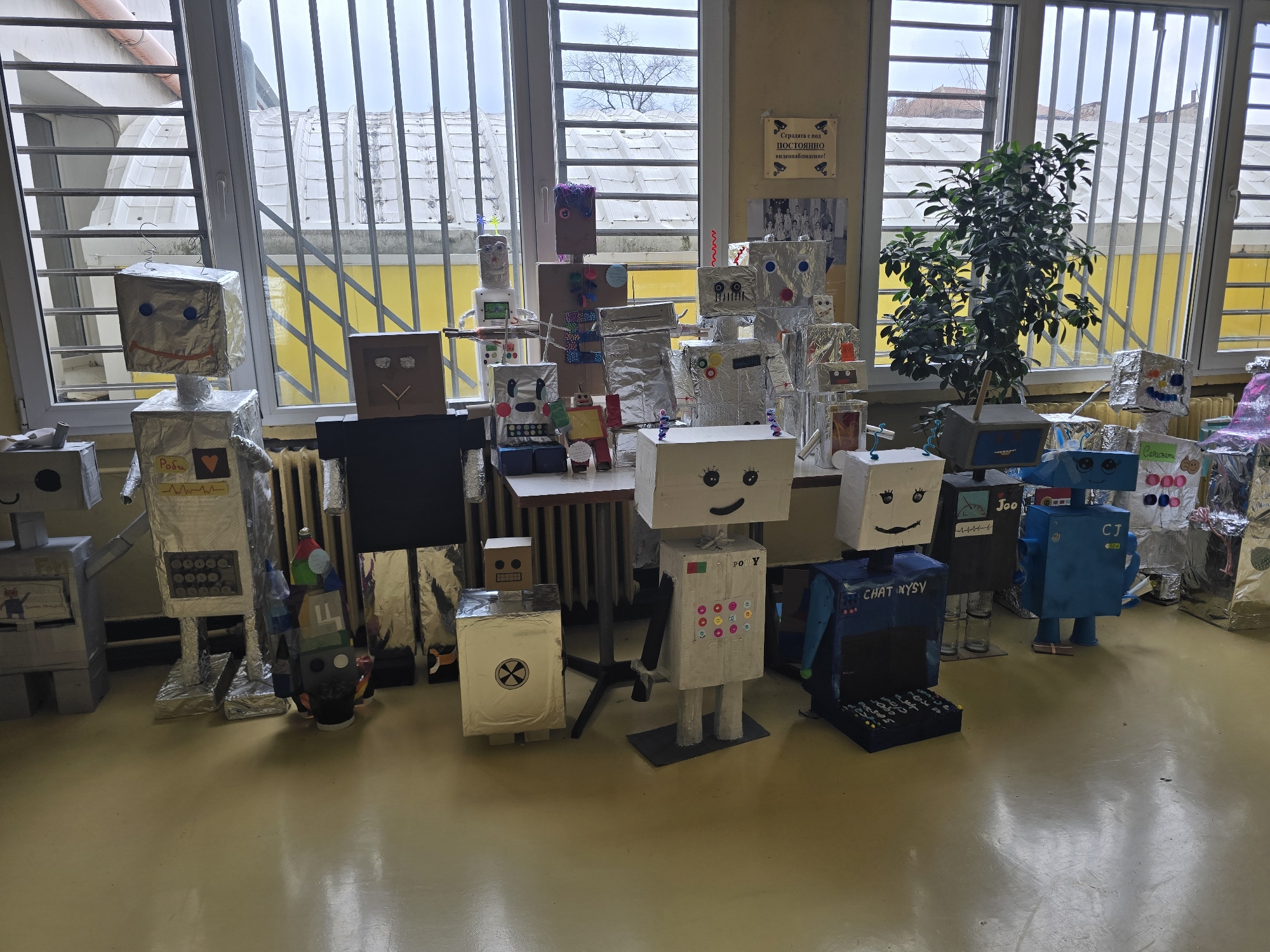 This image captures an indoor scene within the 57th Primary School "St. Naum Ohridski" (57 ОУ) in Sofia, Bulgaria. The primary subjects are approximately 20-25 handmade robots, constructed from materials such as cardboard boxes, aluminum foil, and various craft supplies including buttons, googly eyes, pipe cleaners, plastic containers, and markers. The robots, ranging in height from roughly 30 centimeters to over a meter, are displayed on a brown rectangular table and on the light-colored, reflective floor. A large multi-pane window with horizontal security bars spans the background. Through the window, exterior elements are visible: parts of other buildings with yellow and white facades, corrugated roofs, and bare tree branches against an overcast sky. An orange pipe is present in the upper left corner of the window view. Interior details include light yellow walls, a green potted plant positioned in front of the window, and a white radiator beneath the window. A sign affixed to the wall behind the display reads "СГРАДАТА Е ПОД ПОСТОЯННО ВИДЕОНАБЛЮДЕНИЕ!" (The building is under constant video surveillance!). Another sign, visible on the table, identifies the location as "57 ОУ ИСКРЕН ИЛИЕВ." Specific robot details include a silver robot with a radiation symbol, a blue robot labeled "CHAT NYSY," and another blue robot marked "CJ." Several robots feature drawn or affixed faces and various decorative elements. No individuals are present in the scene. The overall environment suggests an educational display or project exhibition.