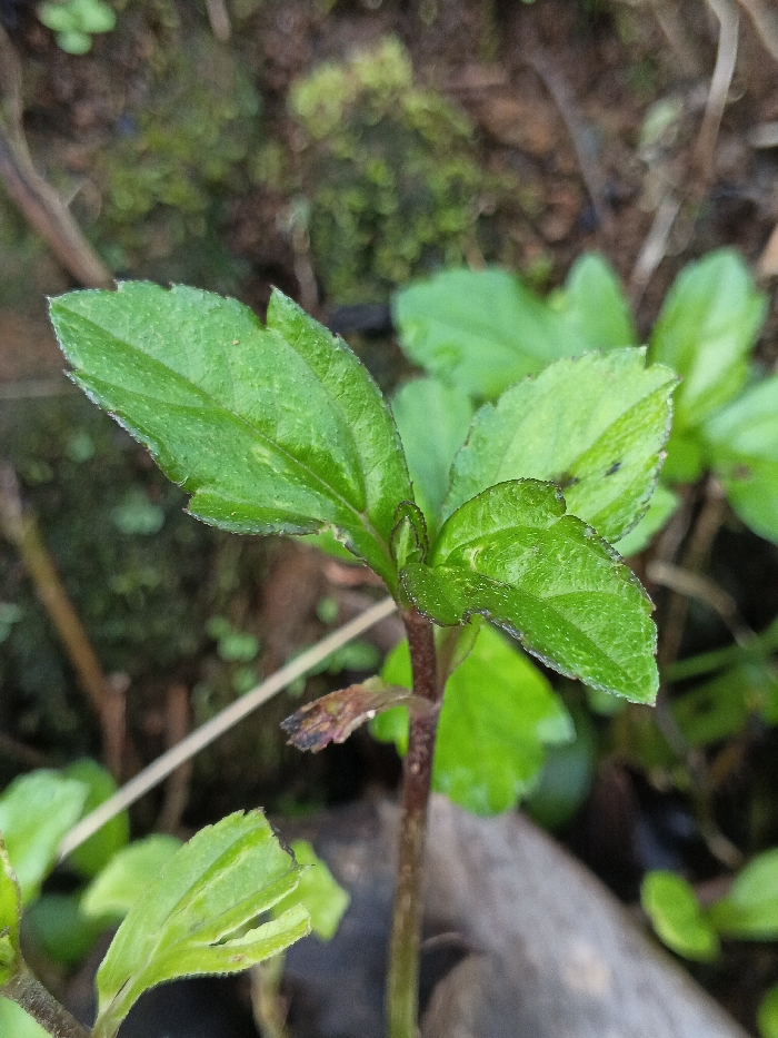 A young plant with vibrant green leaves stands prominently in the foreground. The leaves are textured, with slightly serrated edges. The stem is a reddish-brown color. The background is out of focus, revealing hints of moss-covered ground and other plant life, suggesting a damp, natural environment. A small, dried leaf clings to the stem. Overall, the image captures a close-up view of new plant growth in a woodland setting.
