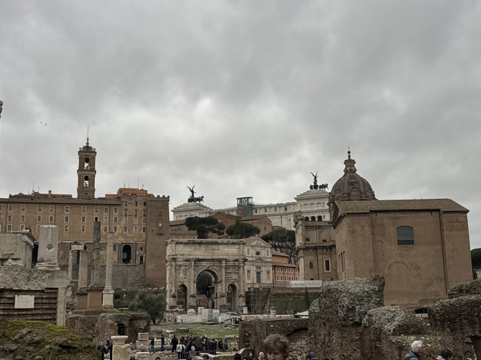 The image displays a panoramic view of the Roman Forum in Rome, Italy, under a uniformly overcast, grey sky. The foreground consists of dark, irregular stone rubble and partial ancient walls, indicative of archaeological excavations. In the midground, numerous individuals, consistent with tourists, are dispersed across the uneven terrain, navigating among fragmented stone structures, pedestals, and vertical column sections. A prominent stone triumphal arch, identified as the Arch of Septimius Severus, stands centrally in the midground, featuring three arched passageways. To the left of the arch, a large, multi-story building with numerous rectangular windows and a tall, square bell tower featuring open arched sections near its apex is visible. To the right of the arch, a reddish-brown masonry building with a distinct dome and terracotta-tiled roof is situated, partially obscuring the background. Further in the background, towering above the ruins, is the white marble Altare della Patria (Victor Emmanuel II Monument), distinguished by its grand classical facade and multiple bronze quadriga sculptures atop its highest sections. The entire scene is illuminated by soft, diffused daylight, consistent with the cloudy atmospheric conditions.