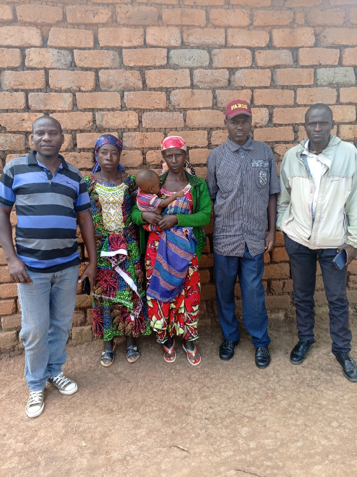 An outdoor group portrait in Abengwa, Democratic Republic of the Congo, shows five adults and one infant standing in a line against a rough, unpainted brick wall
