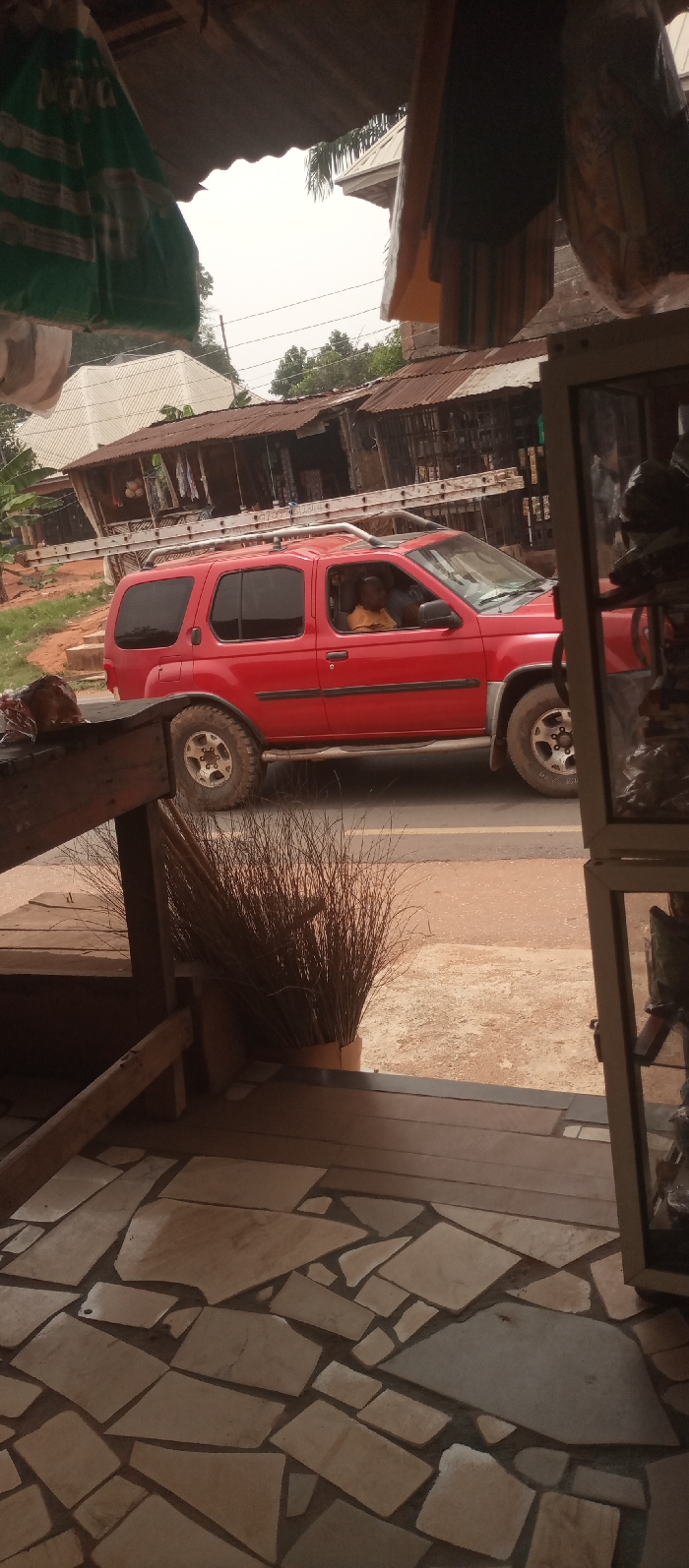 The scene, located in Umuoji, Nigeria, is depicted from a low, covered vantage point, possibly an open-fronted shop or stall. In the immediate foreground, an irregularly patterned floor composed of varying shades of light brown and beige flagstones is visible. A robust wooden support beam stands vertically on the left, beside which a large bundle of dried, dark brown branches or reeds is positioned upright. On the far right, a portion of a white-framed display unit is visible. Overhead, dark corrugated roofing is present, with a green and white striped bag and other fabric items hanging down. The midground shows a paved road with a light brown, unpaved shoulder on the left. A red four-door Nissan Xterra SUV is situated on this road, traveling or stopped, facing the viewer's left. A silver extension ladder is securely affixed to the vehicle's roof rack. Inside the SUV, a dark-skinned individual wearing a light-colored (possibly yellow) short-sleeved shirt is visible in the driver's seat, looking forward. In the background, across the road, several buildings are present. On the left, a structure with a light-colored, multi-pitched roof is visible. To its right, a row of lower structures with rusty corrugated metal roofs lines the street, appearing to be commercial stalls with various items displayed on their exteriors. Dense green vegetation and trees are visible behind and between these buildings, beneath a bright, overcast sky.