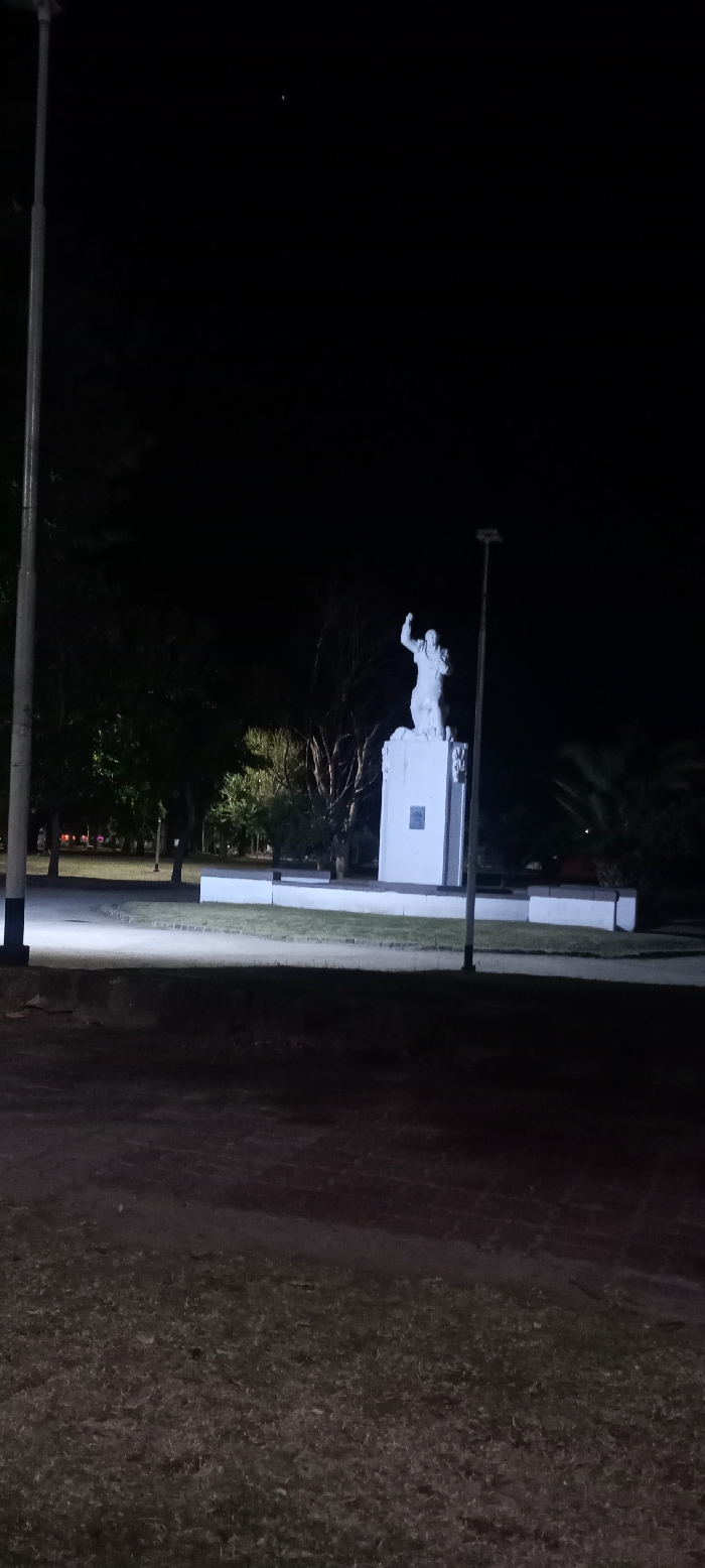 - "A statue of a person with an arm raised stands atop a white pedestal in a park at night" by FM-kzA8r2, licensed under CC BY 4.0