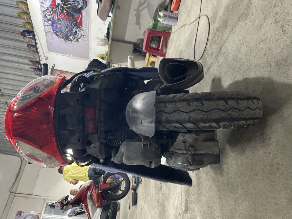 A rear view of a disassembled motorcycle reveals its tire, exhaust, red tail light, and suspension system. Two people are visible in the background, along with another motorcycle. The surroundings consist of a garage or workshop setting, marked by a concrete floor, posters on the walls, and various tools and equipment. The image highlights the mechanics and maintenance of motorcycles within an auto shop.