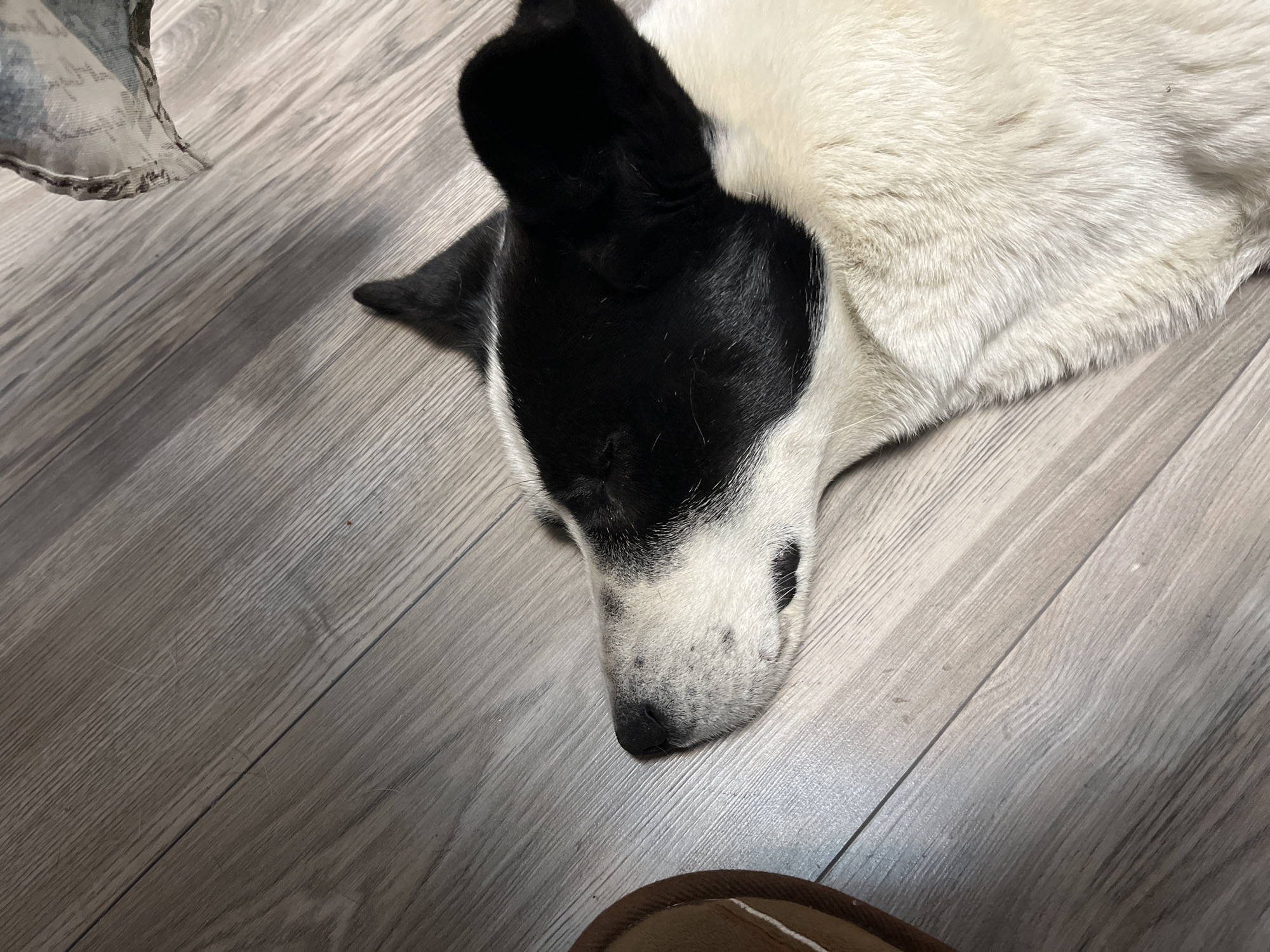 A black and white dog is depicted lying asleep on its right side on a light wood-grain laminate floor in Karavelovo, Bulgaria