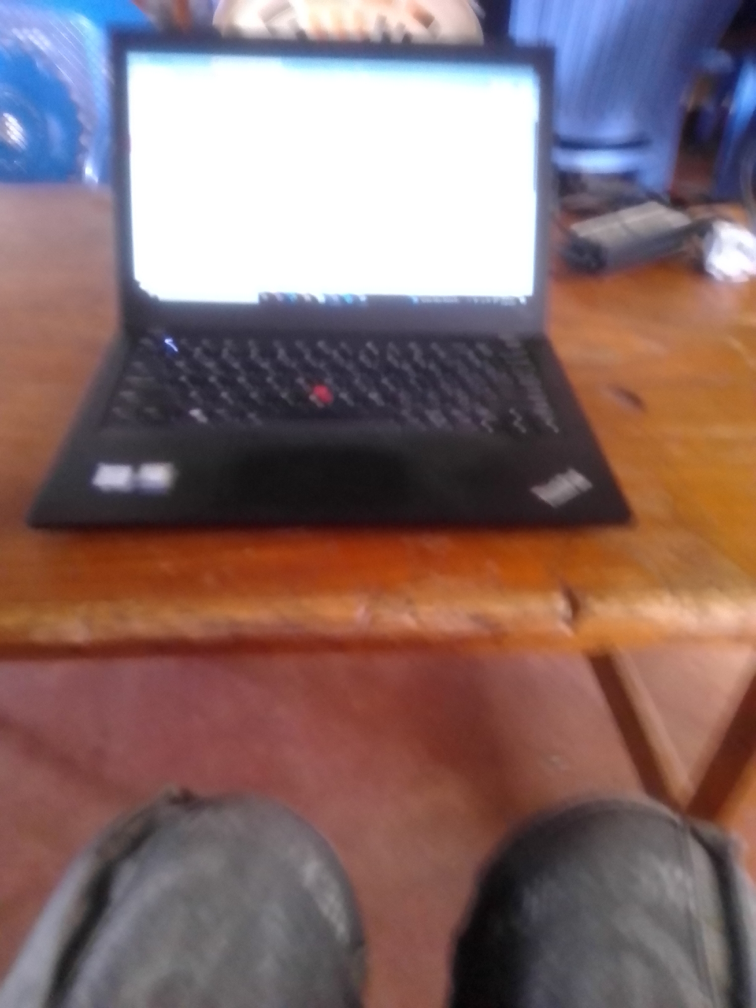 The scene depicts a black laptop computer resting on a light brown wooden table, observed from a seated perspective in Ndeiya, Kenya. The laptop screen is illuminated, displaying a predominantly white background with a taskbar and several application icons visible at the bottom. A red trackpoint is present on the black keyboard. Below the table, the knees of an individual, clad in dark fabric, are partially visible. In the blurred background to the left of the laptop, a blue object with a ribbed texture is present. To the right, out-of-focus items include a gray rectangular power adapter or device and crumpled white material, with a blue vertically striped pattern visible further back.