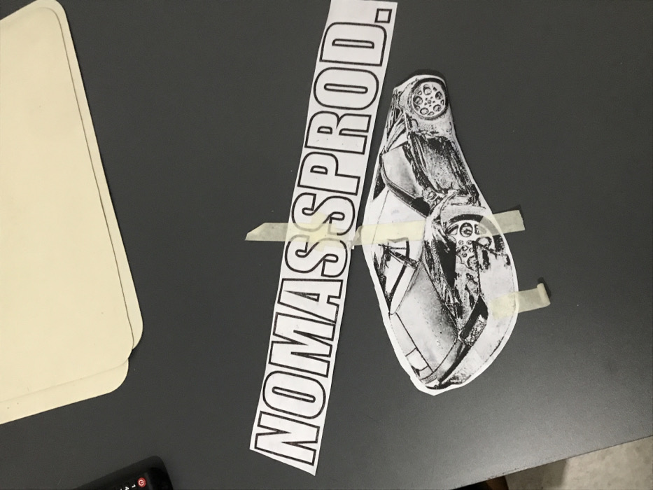 A gray surface features a stack of beige cards in the upper left. Two strips of paper are taped down: one with the word "NOMASSPROD." printed vertically in bold, outlined letters and another showing a roughly cut black and white image of a car interior, viewed from above, including the dashboard and steering wheel. A black remote control lies at the bottom left edge of the surface.