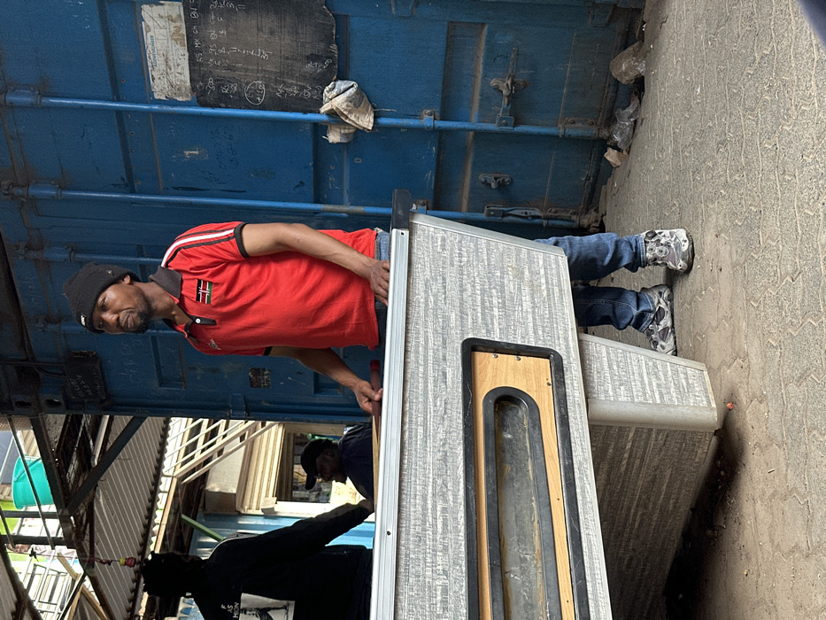 A man in a red shirt and black beanie stands behind a gray cabinet. He is wearing blue jeans and sneakers. Another man stands to the left of the cabinet, and another is in the background. The cabinet has a wooden panel with a black trim. A blue storage container is behind the first man. The scene is outside on a paved surface.