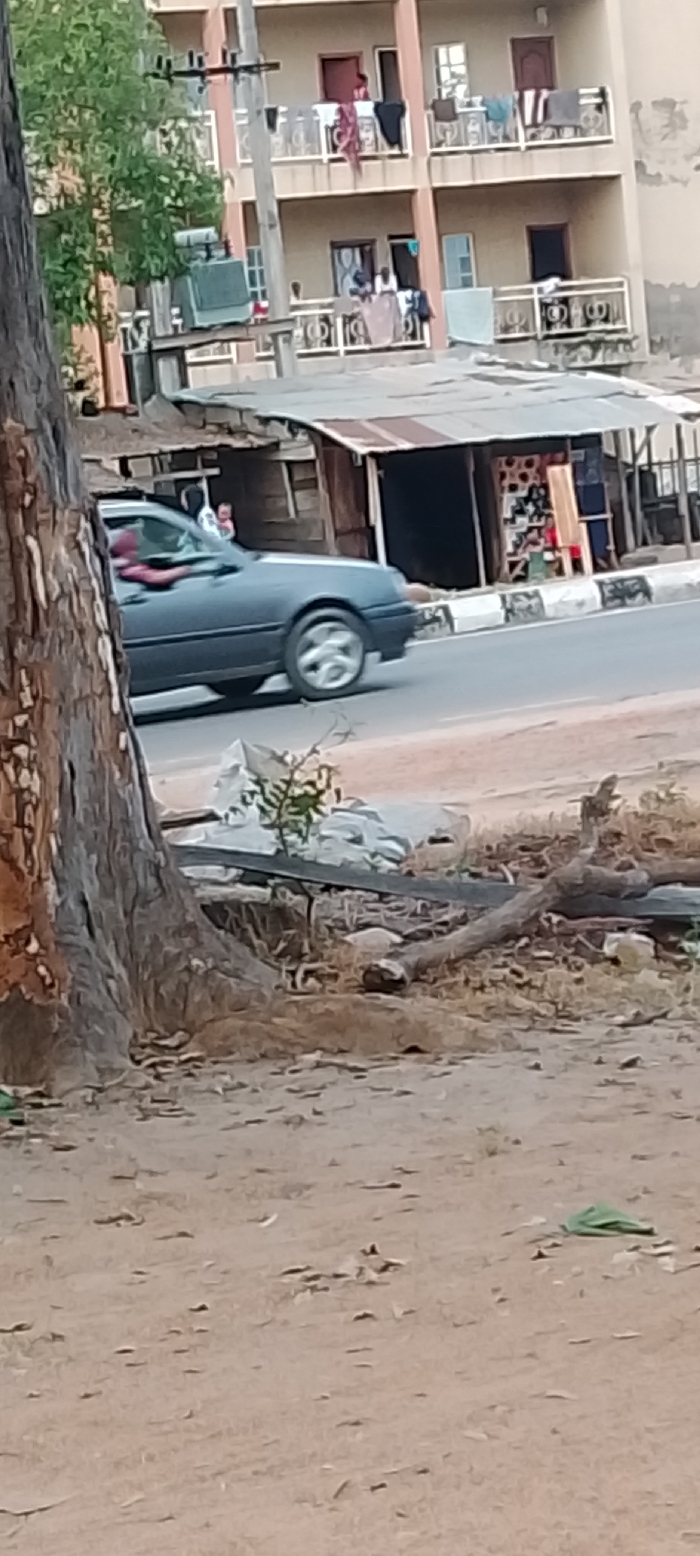 The image captures a daylight street scene identified as Zango-ndaji, Nigeria. The foreground on the left is occupied by the textured, brown trunk of a large tree, beyond which lies barren, light brown soil scattered with small debris and a singular green plant. A dark-colored sedan car is in motion on a paved road, traveling from left to right across the midground. A driver, partially visible and wearing a red garment, operates the vehicle. The paved road is bordered on its right by a black and white striped curb. Across the road, a series of small, single-story structures with corrugated metal roofs are visible, appearing to be street-side vendor stalls. One stall displays various merchandise, including what appears to be hanging fabrics. In the background, a multi-story residential building with a light brown facade features balconies on each of its visible floors. Clothes are hung to dry on several of these balconies. On one mid-level balcony, two or more indistinct human figures are discernible, one appearing to be seated. A utility pole supporting a transformer is positioned to the left of this building. Green tree foliage is visible in the upper left portion of the frame.