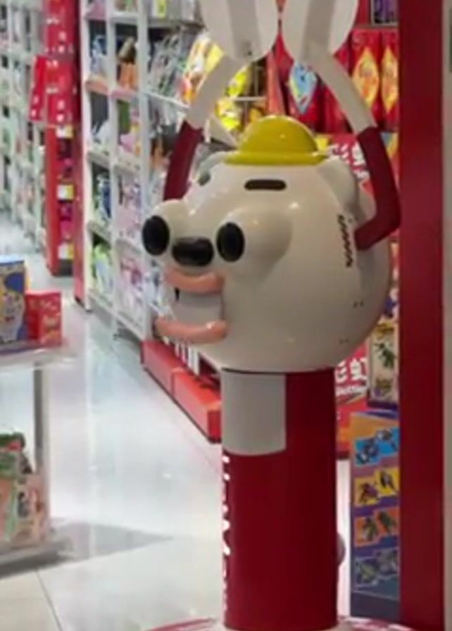 stationary, cartoonish, human-sized mascot figure inside a shop. The figure is mostly white, with a rounded head wearing a yellow hat and a red base with white stripes. It has large, cartoon eyes and a small, protruding mouth. The arms are raised, holding what appear to be white cardboard cutouts above its head. The mascot is positioned near a display of goods on shelves in the background. The shop appears to be well-lit with tiled floors.