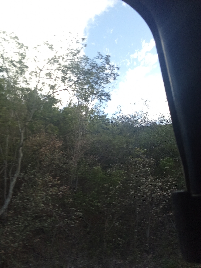 The image presents a view captured from inside a vehicle, looking outward through an arched window frame positioned along the right side of the frame. The scene depicts a dense, predominantly green, and brownish-green hillside or forested area under a bright sky with scattered white clouds, indicative of daytime. Various trees and shrubs with differing foliage densities and some visible light-colored trunks dominate the middle and lower portions of the frame. The vegetation appears vibrant and thick. The overall image exhibits slight motion blur, suggesting the photograph was taken from a moving vehicle. No individuals, specific structures, or discernible actions or interactions are visible. The natural, verdant environment is consistent with the type of tropical or subtropical landscape found in the vicinity of La Asunción, Margarita Island, Venezuela.
