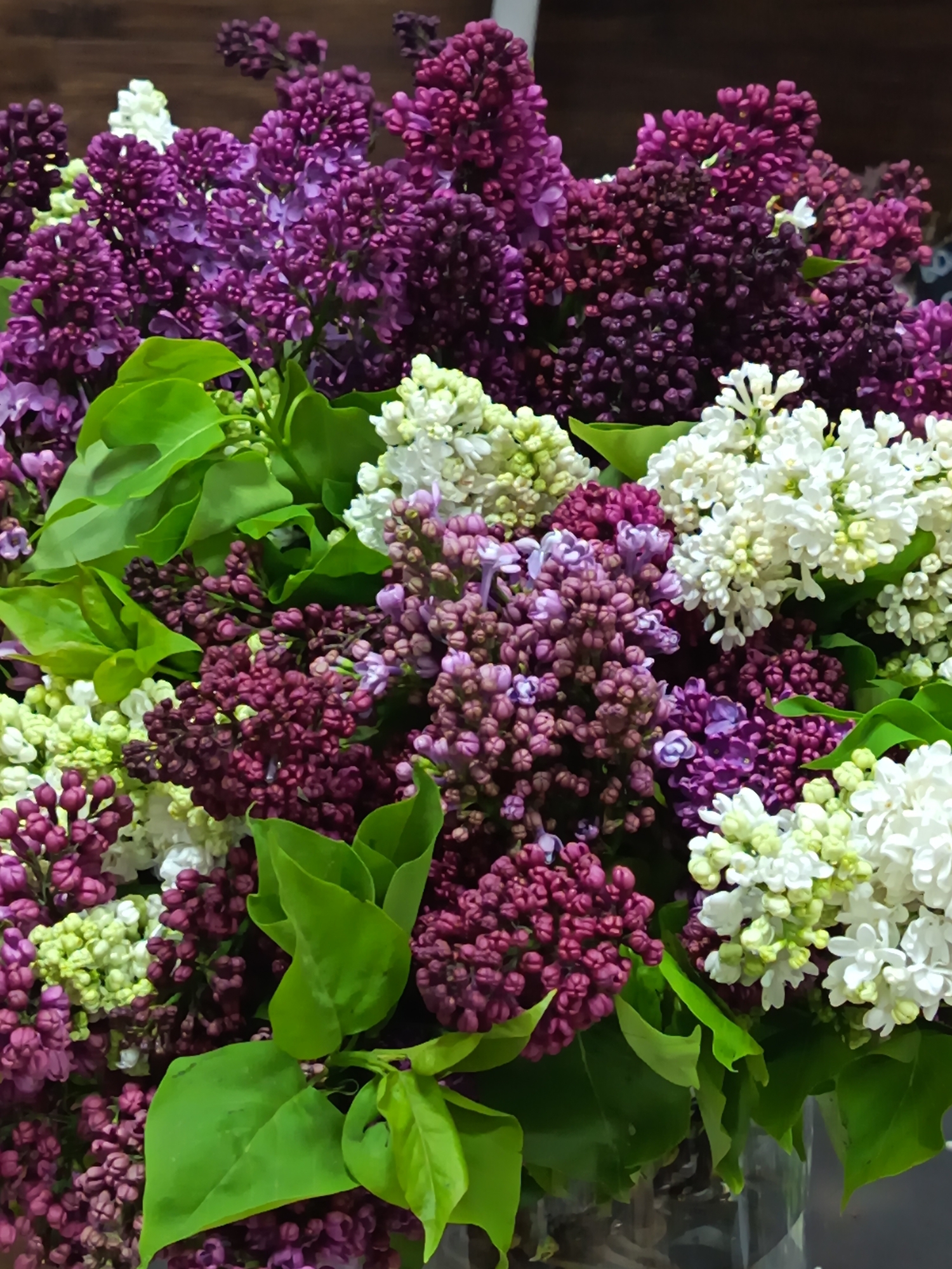 A close-up shot of a bouquet of lilacs. The flowers are of varying colors including purple, dark red, light purple and white. The bouquet has a few green leaves throughout. The exact location in Nizhnevartovsk, Russia, is indeterminable from the image.