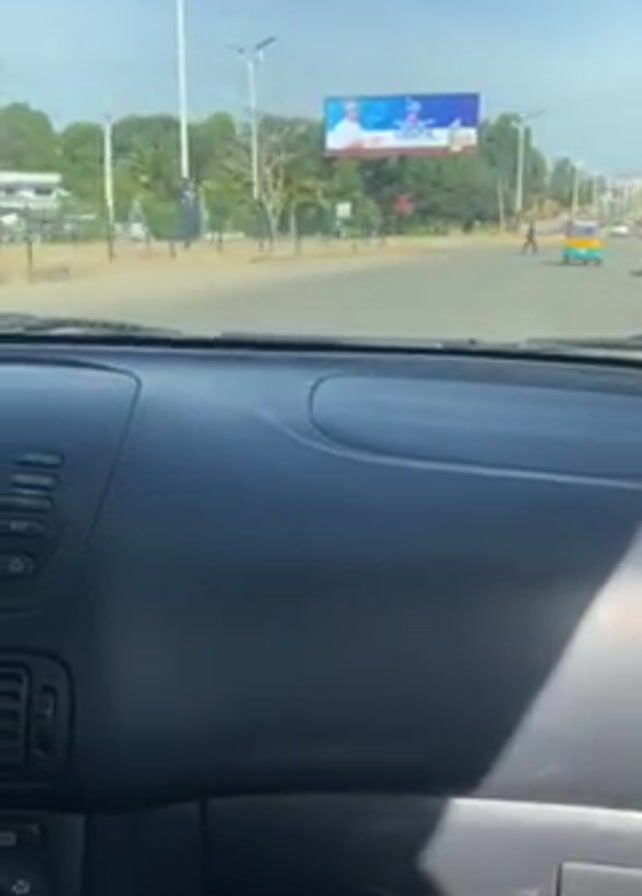 The video, taken from inside a car, shows a road with a large billboard on the right side