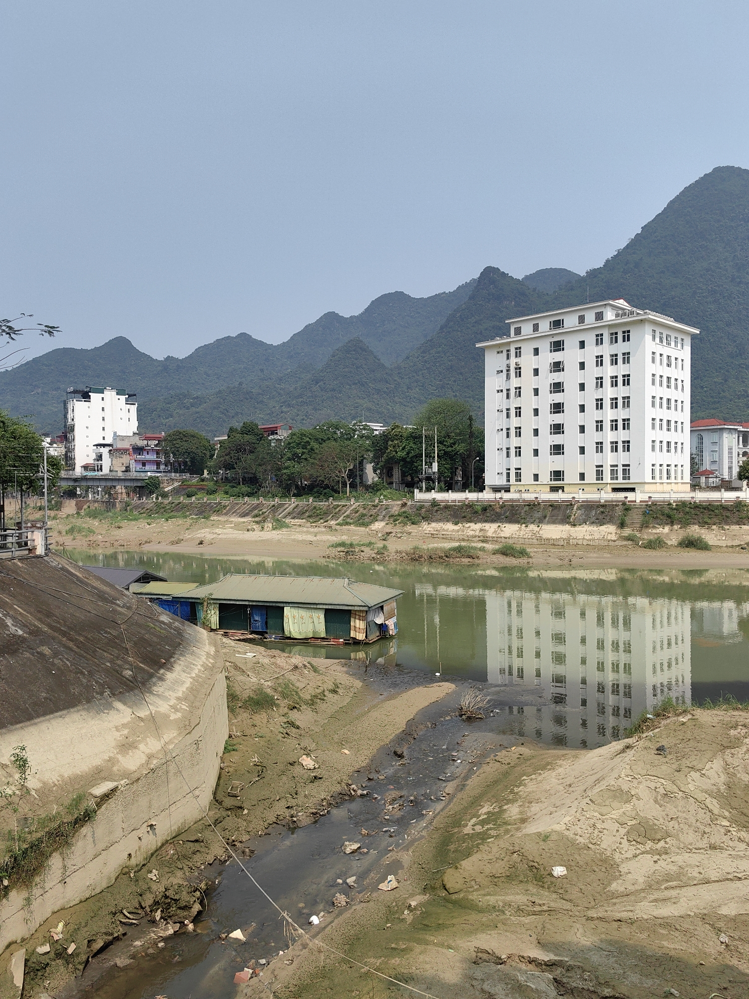 The image depicts a low river scene in Thành phố Hà Giang, Vietnam. In the foreground, a concrete retaining wall borders a channel with stagnant water and debris. Adjacent to the channel is a small floating structure. The river itself reflects a large, white building located on the opposite bank. This building is a multi-story structure with rows of windows. In the background, a range of tree-covered mountains rises behind the town. The sky is overcast.