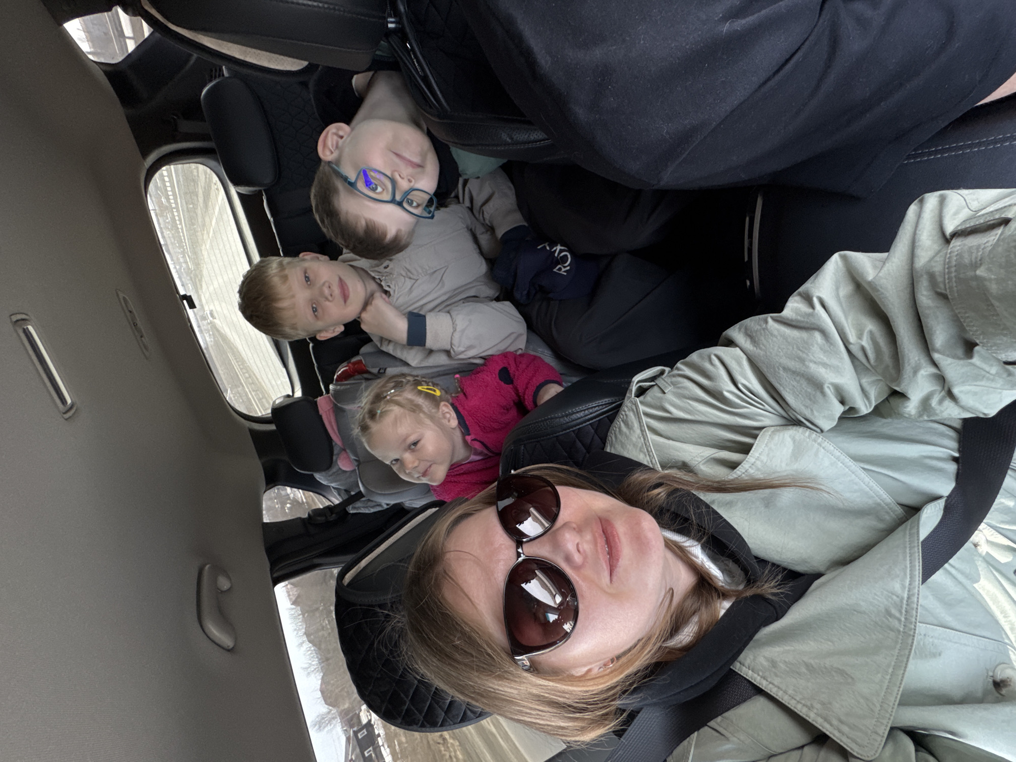 woman taking a selfie in the front passenger seat of a car. She is wearing sunglasses and a light green jacket. In the back seat, there are three children: two boys and a girl. One boy is wearing glasses and another is in a gray jacket. The girl is wearing a pink jacket. The car is likely traveling in Фролы, Russia, as indicated by the buildings visible through the window.