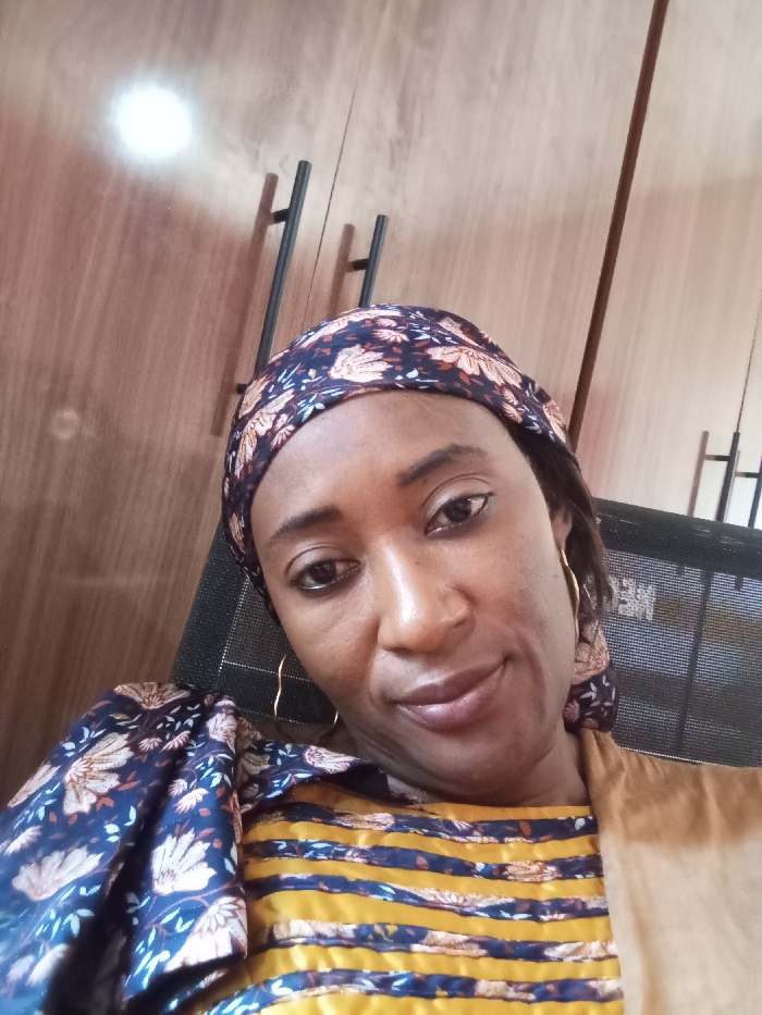 A close-up portrait features an adult female of African descent, smiling gently, taken indoors. Her complexion is light brown, with dark eyes defined by eyeliner and thin, dark eyebrows. She wears gold-colored, wavy hoop earrings. Her head is covered with a dark headwrap patterned with orange, light brown, and white floral motifs. She is dressed in a yellow garment featuring horizontal stripes of the same dark floral pattern, with a visible puffed sleeve on her left side. A segment of light brown fabric is visible on her right. The background is a wooden surface, consistent with a wardrobe or cupboard, displaying prominent wood grain and two dark, vertical handles. A circular light reflection is present on the upper left of the wooden surface. A dark, mesh-patterned object, resembling a chair backrest, is partially visible behind the subject's right shoulder. The precise location within Kaduna, Nigeria, cannot be determined from the visual information provided.