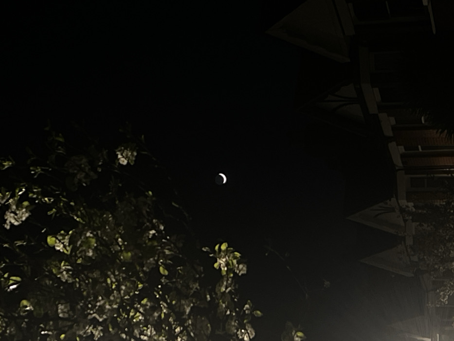 The image depicts a nocturnal scene in a residential area of London, United Kingdom. A slender white crescent moon is visible against a dark, clear sky, positioned slightly above the frame's horizontal center. In the upper left quadrant, the foliage of a tree, displaying green leaves and white blossoms or light-colored elements, is partially illuminated, likely by an unseen streetlamp. Below, a row of multi-story residential buildings, consistent with Victorian or Edwardian terraced or semi-detached houses, extends horizontally across the frame. These structures feature distinctive gabled roofs and bay windows, with some interior lighting faintly visible through windows and external artificial light subtly illuminating portions of the brick facades. No people, actions, or interactions are visible.