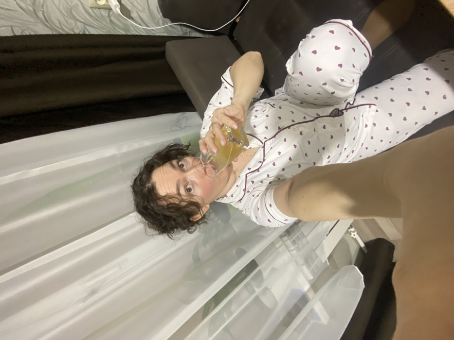 An indoor photograph taken in Ольховка, Russia, depicts a female subject from a selfie perspective. The subject has short, dark, curly hair and is wearing white pajamas with a repeating pattern of small, dark red hearts and dark red piping along the seams. She is holding a clear glass containing a light amber liquid to her mouth and appears to be in the process of drinking. Her right arm is extended towards the camera. The background on the left features a sheer white curtain. To the right, a dark brown curtain and a light-colored patterned wall are visible, which includes a white electrical outlet with a white charging cable plugged in and descending. A dark brown sofa or armchair is partially visible in the lower right portion of the frame.