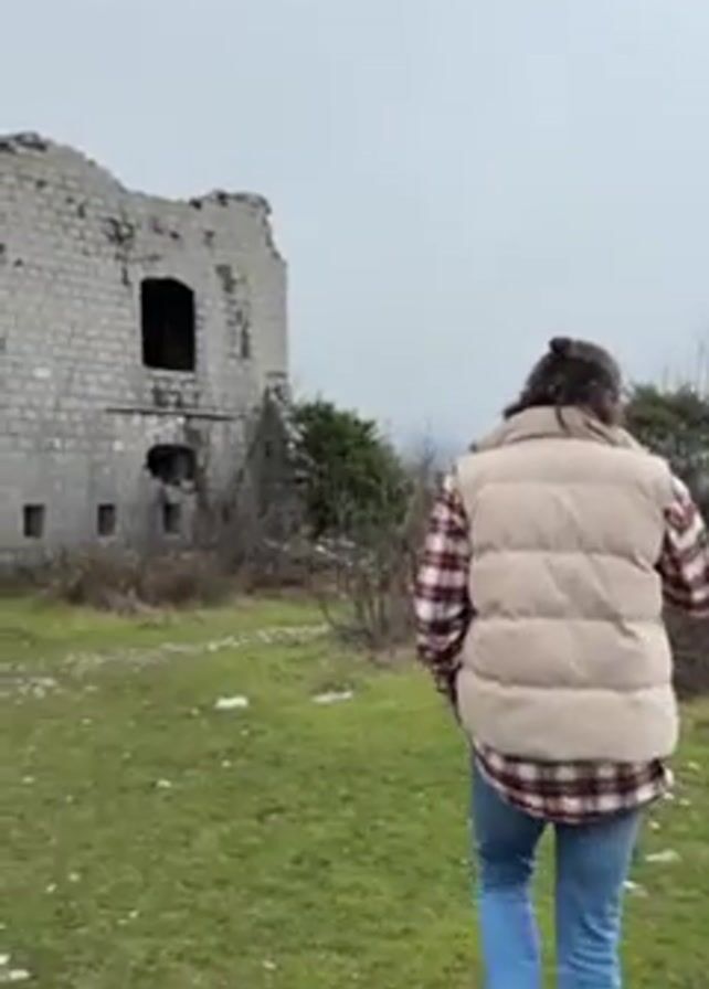 A person wearing a tan vest, a red-and-white plaid shirt, and blue jeans walks across a grassy area towards a large, crumbling stone building. The building is in ruins, with large holes where windows and doorways once were. The sky is overcast.