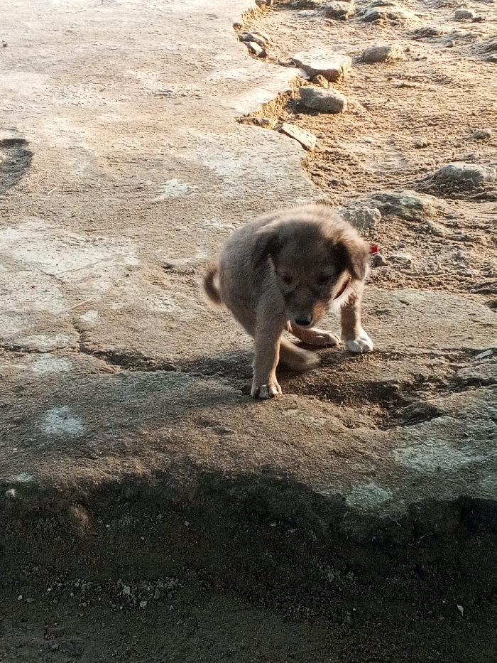 A small, brown puppy stands on a concrete surface that is cracked and uneven, casting a shadow in the lower portion. The puppy's fur appears soft, and its tail is slightly curved. The background features a rough, earthy terrain with scattered rocks and variations in texture, suggesting an outdoor environment. The light source casts a warm glow, enhancing the contrast between the shadowed and illuminated areas.