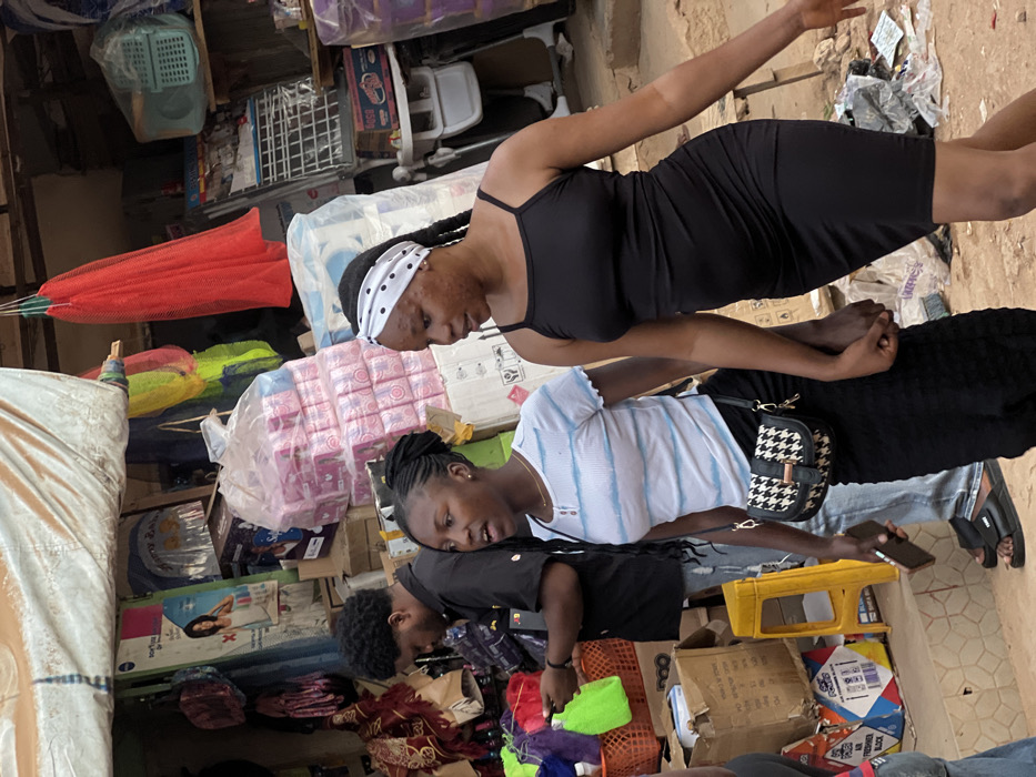 In an outdoor market setting, a group of people are gathered. Two women are prominent: one in a black dress and a white headband, the other in a light blue and white striped shirt. A person in black is visible below them. Market goods are densely packed around them, including packaged sanitary products, baskets, and other miscellaneous items. The setting suggests a bustling, possibly crowded, commercial area.