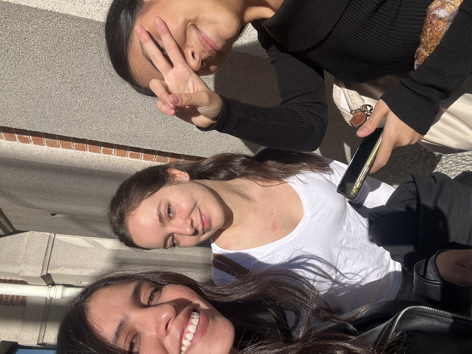 Three young women are photographed outdoors in Madrid, Spain, positioned against a building facade under strong sunlight. The woman on the left, partially visible, has long, dark hair, smiles, and wears a black jacket. The central woman has long, brown hair, smiles, and wears a white V-neck shirt; a small reddish mark is present on her upper chest. The woman on the right, partially visible, holds her right hand in a V-sign gesture across her face while smiling, and holds a gold-colored smartphone in her left hand. She wears a black, long-sleeved ribbed top. A light-colored bag is visible beside her. The background consists of a building with a textured gray wall, light-colored stone architectural details, and a section of red brickwork. A white vertical pipe is affixed to the facade. The location is an unidentified urban building within Madrid, characterized by common Madrilenian architectural elements.