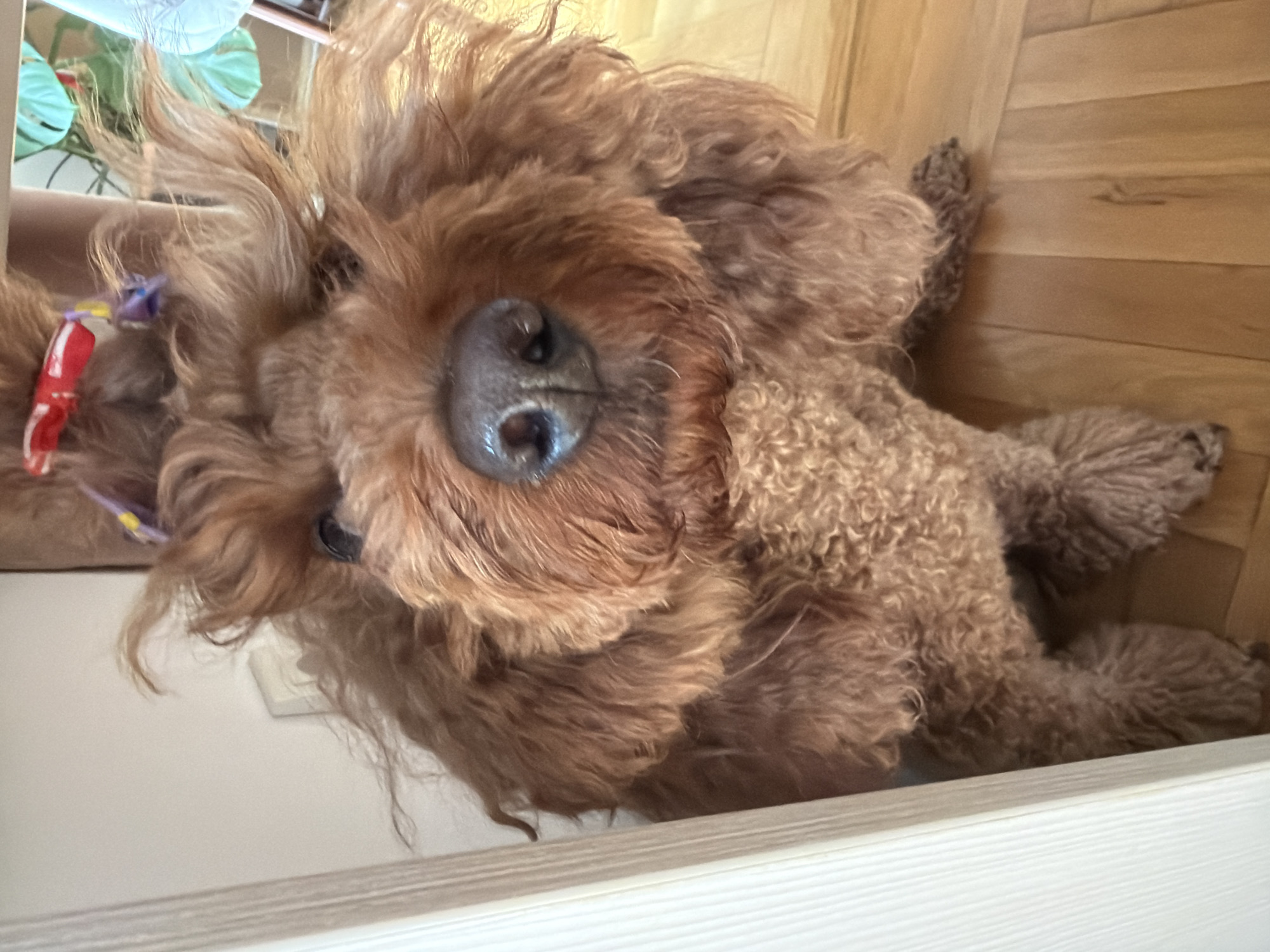 - "A close-up, high-angle shot features a brown poodle-like dog lying down" by FM-QkAq42, licensed under CC BY 4.0