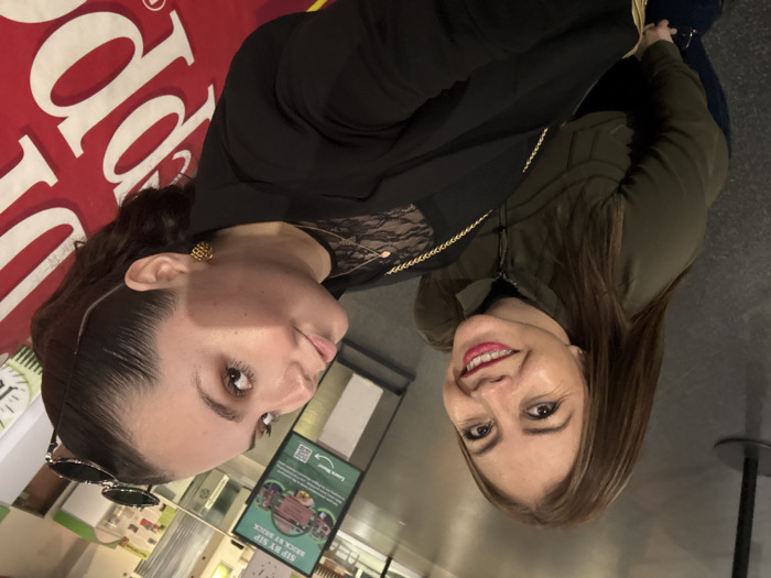 Two women are posing closely together in an indoor setting. The woman on the left has dark hair pulled back, fair skin, and wears a black top with a lace neckline. The woman on the right has shoulder-length light brown hair, fair skin, and wears a green jacket. Both women are facing the camera with smiles. A red and white sign is partially visible in the background, along with a green sign and interior building elements.