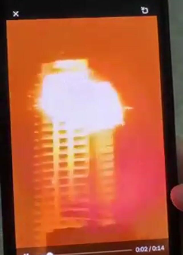 phone displaying a video of a large explosion occurring near a tall building