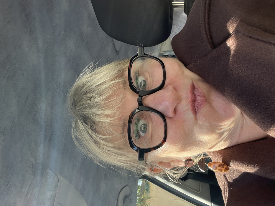 A close-up, chest-up portrait of an adult female is captured inside a vehicle in Montrond-les-Bains, France. The female has blonde hair with bangs and is wearing large, dark-framed eyeglasses. Her eyes are crossed, and her lips are pursed in a puckered expression. A dangling earring with dark circular elements and an ovoid, speckled brown and orange bead is visible on her left ear. She is wearing a dark brown coat. The vehicle's light gray headliner is visible above her, and a dark headrest is behind and to her right. Sunlight illuminates the scene from the left, revealing a light-colored building wall and sparse foliage through the vehicle window.